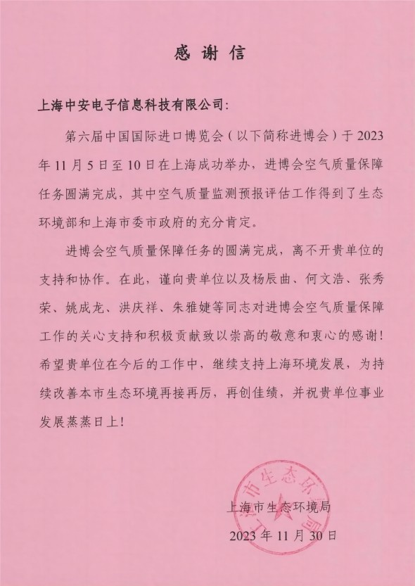 上海環監中心就中安科技在21年國際進博會空氣質量監測預報工作中杰出貢獻送來感謝信!(2021/12/31)